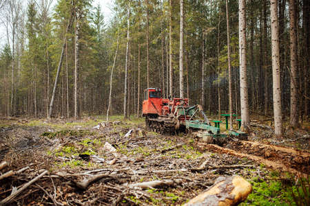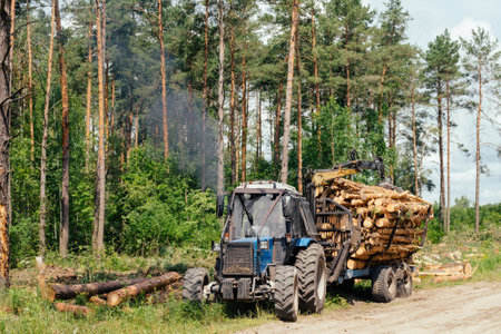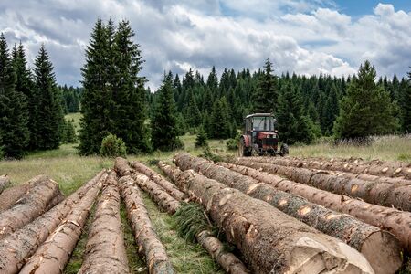 Red Tractor Pulling Tree Logs for Timber Industry. Felling of the Green Forest.