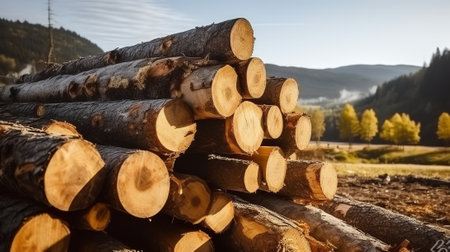 AI Generated. Stacked logs ready for processing at a timber mill in the early morning light