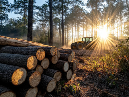 Morning sun shines on stacked logs in forest with tractor, showcasing forestry s natural beauty