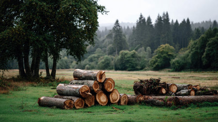 AI Generated. Tranquil Scene of Stacked Logs in Misty Forest Logging Site