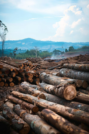 Stacked timber logs and fresh tree stumps on cleared earth next to a dense forest line. young saplings indicate reforestation efforts in this sustainable logging zone.