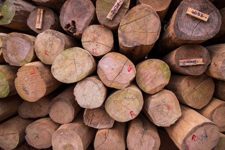 Closeup view on timber pilled up on each other. They are waiting to be transported into a sawmill.