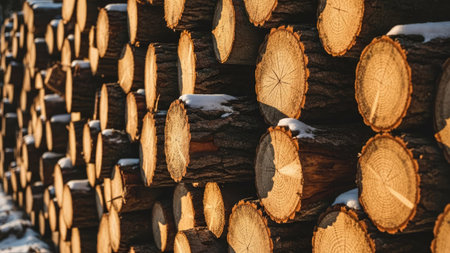 Sturdy logs lie in neat rows, their smooth ends glowing in soft autumn light.