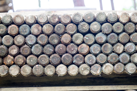 Stacked wooden logs in a warehouse, close-up. Industrial background