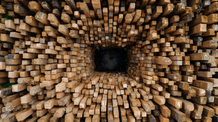 A serene scene featuring stacks of timber planks under a bright sky, perfect for illustrating construction, woodworking, or outdoor activities in natural settings.