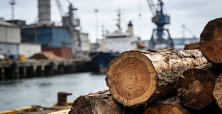 Tall stacks of timber beams ready for export at a busy shipping dock.