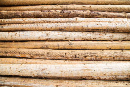 Natural abstract wooden timber background with texture of bundles of logs in rustic style. Raw materials for lumber. Deforestation, ecology and ecosystem
