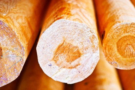Close-up of freshly cut logs, showing the rings and grains of natural wood material