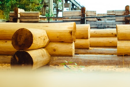 Wood and Sawmill. Large round logs harvested for construction.
