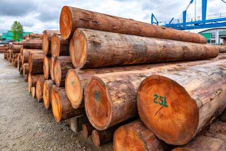 Neatly arranged logs in a logging area with industrial equipment in the background under a dramatic sky. A perfect representation of wood processing and forestry.