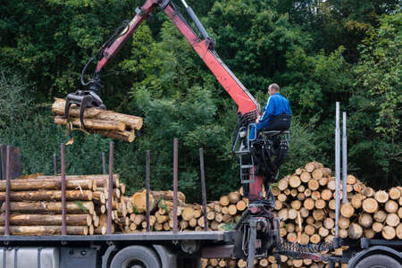 loading logs into a truck, a manipulator car folds trees for transportation, Russia, Kaliningrad region, July 29, 2019