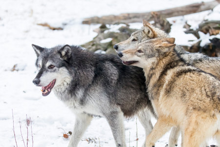 Three wolves in the winter forest. Canis lupus.