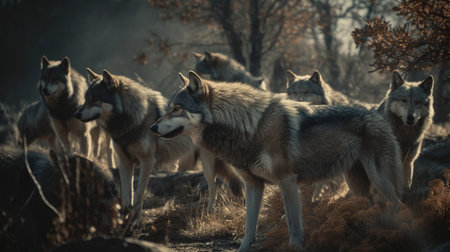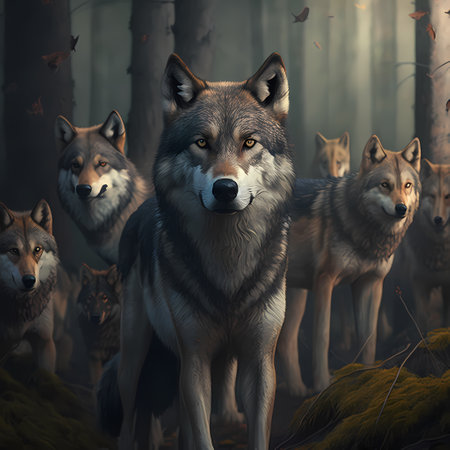 3D rendering of a pack of wolves in a dark forest.