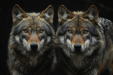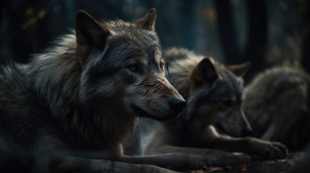 Two wolves in the forest on a dark background, close-up