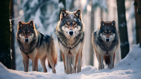 Pack of hungry wolves hunting in winter. distinct generative AI image.