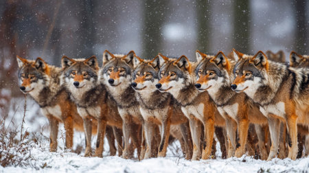 A line of wolves stands side by side in a snowy forest setting, showing their strong presence amidst falling snowflakes while displaying social behavior.