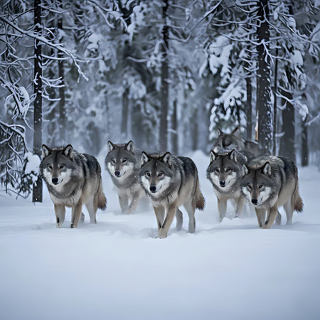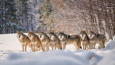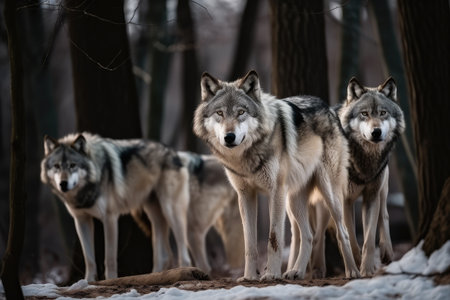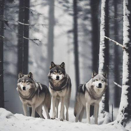 An image of a pack of wolves standing alert in a snowy forest, symbolizing strength and unity in nature.