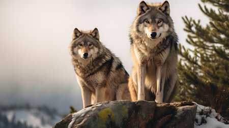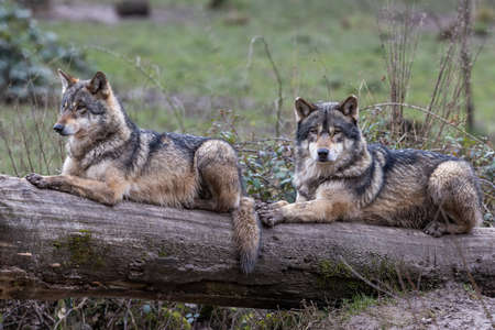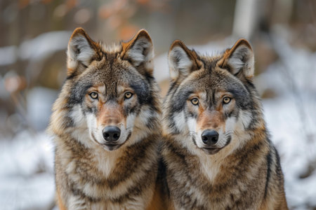 Portrait of two wolves in winter forest. Two wild animals.
