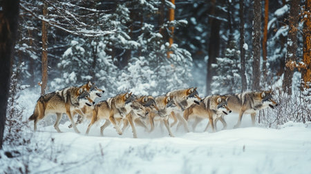 Pack of wolves sprints energetically through deep snow in a forest setting. Snowflakes fall gently as the wolves blend into their wintry surroundings, showing their natural behavior.