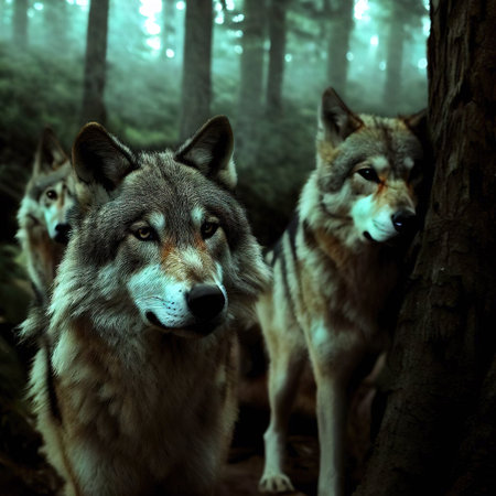 Three gray wolves in a foggy woodland setting, exuding wildness and alertness