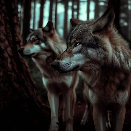 Amidst shadows dark forest adult wolf keeps vigilant watch its curious cub embodying bond family and natures beauty.