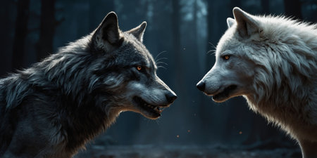 AI Generated. white versus black wolves - duel of good and evil concept art - a white wolf versus a black wolf - fantasy illustration - profile view of both wolves looking at each other in a face off duel