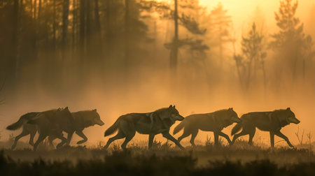 Silhouettes of wild wolves running in a misty forest.