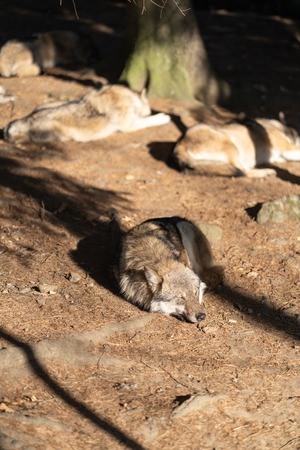 A pack of wild wolves are sleeping in the sun. One Wolf in the foreground.