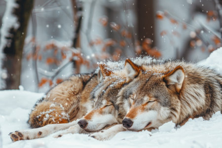 Wolves resting in the snow, lying down and relaxing in a peaceful, snow-covered forest surrounded by trees and frosty scenery.. AI generated.