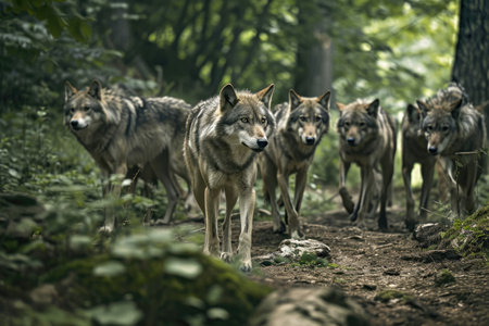 a pack of wolves hunting together, in the forest