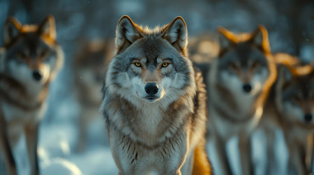 Wolves with piercing gazes leading pack.