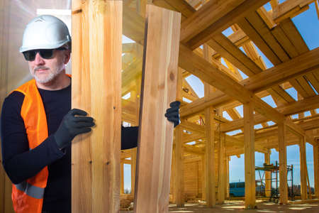 Builder. Human next to a house under construction. Concept - sale of lumber for frame houses. Frame of a wooden house from the inside. Man holds two boards. Builder in sunglasses. Career builder