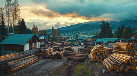A serene timber yard at sunset features large stacks of logs in a picturesque setting surrounded by mountains and dense forests. The scene captures tranquility and nature's beauty.