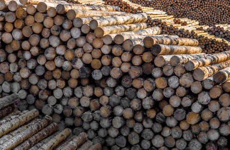 Natural wooden logs cut and stacked in pile, felled by the logging timber industry, Abstract photo of a pile of natural wooden logs background