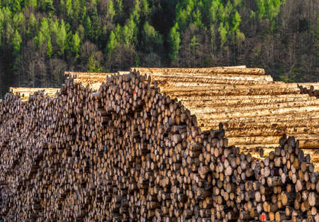 Heap of logs in a forest, deforestation concept