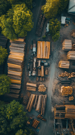 Aerial view of a wood processing site featuring neatly arranged stacks of timber and logs surrounded by trees. The facility is busy with machinery and equipment.