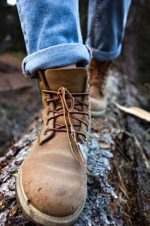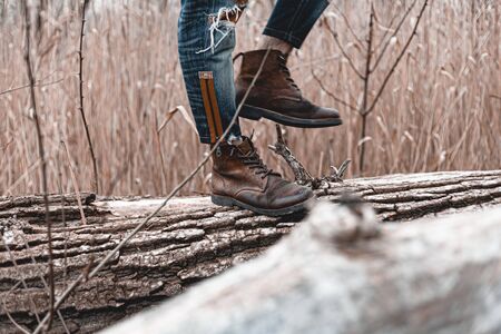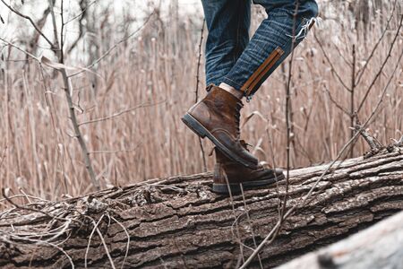 Male legs in brown boots on fallen leaves next to a wooden snag. Close-up