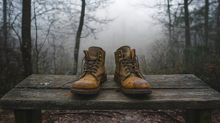 A pair of worn brown leather boots rests on a weathered wooden table in a fog-laden forest, evoking themes of adventure and exploration in nature.