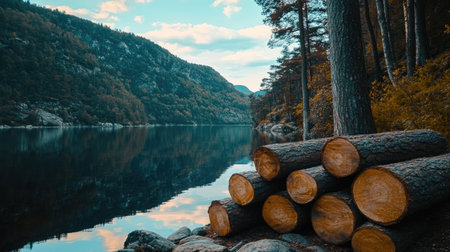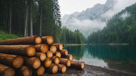 This captivating image captures a serene forest setting with a stack of logs by a tranquil lake, embraced by misty mountains and lush trees, evoking peace.