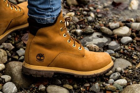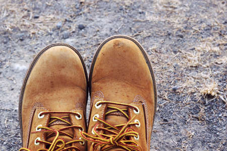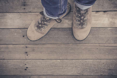 Guy hiking in comfortable hiking boots. Boots close-up stock photo.