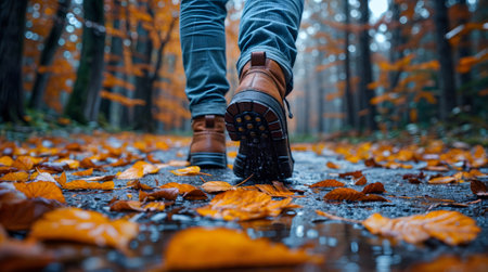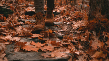 A close-up of a person walking on a rocky path blanketed in vibrant autumn leaves. The brown boots add a touch of warmth to the serene nature scene.