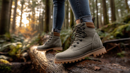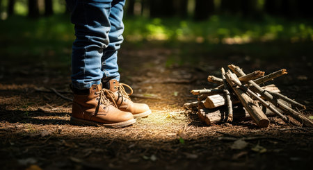 Leather hiking boots. Tourist standing in forest. Close-up legs with waterproof sport shoes