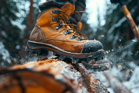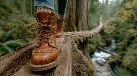 Muddy trekking shoes grip a wet log in a rainy jungle, symbolizing determination and perseverance in overcoming obstacles in a challenging adventure.