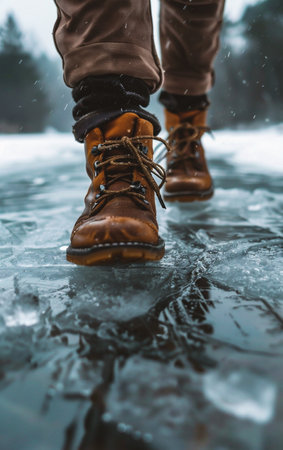 A person is standing on a log in the snow with their feet in the snow. The person is wearing a pair of brown boots