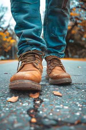 Close-up of a person wearing leather shoes and old jeans walking alone on the sidewalk. Suitable for the concept of unemployment, going on adventures, independence, Finding myself, seeking experience.