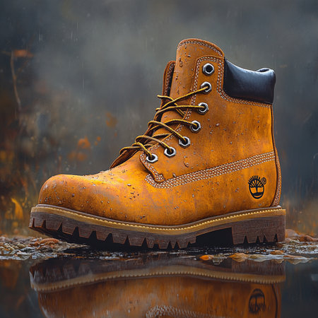 A close view of bright yellow boots on a muddy trail, surrounded by mist-filled greenery. The atmosphere feels refreshing and adventurous, inviting exploration in nature's embrace.