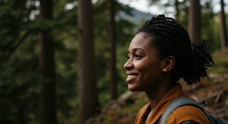 Smiling woman enjoying nature for digital detox retreat. Serene female finding clarity for mind, escaping city, burnout, slow life and meditation in forest