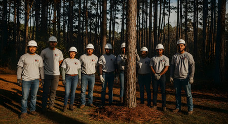 A diverse team of nine workers, including one woman, stands together for a group portrait in a pine forest. They are all wearing matching grey t-shirts, blue jeans, and white hard hats, looking at the camera.