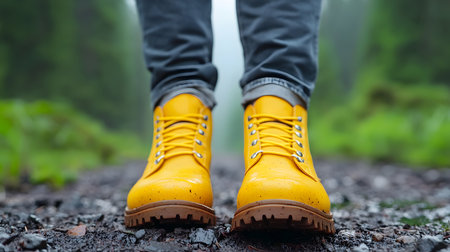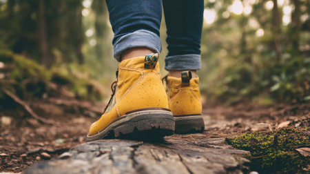Bright yellow hiking boots stand out on a forest trail, showcasing a vibrant touch against the earthy tones of the woods. Perfect for adventure lovers!