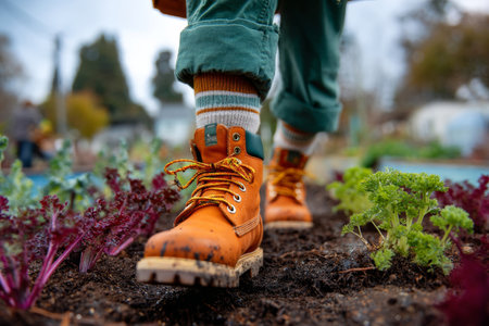 A close-up shot of a person wearing orange muddy boots walking on garden soil, surrounded by leafy green and purple vegetables in an outdoor farm setting.